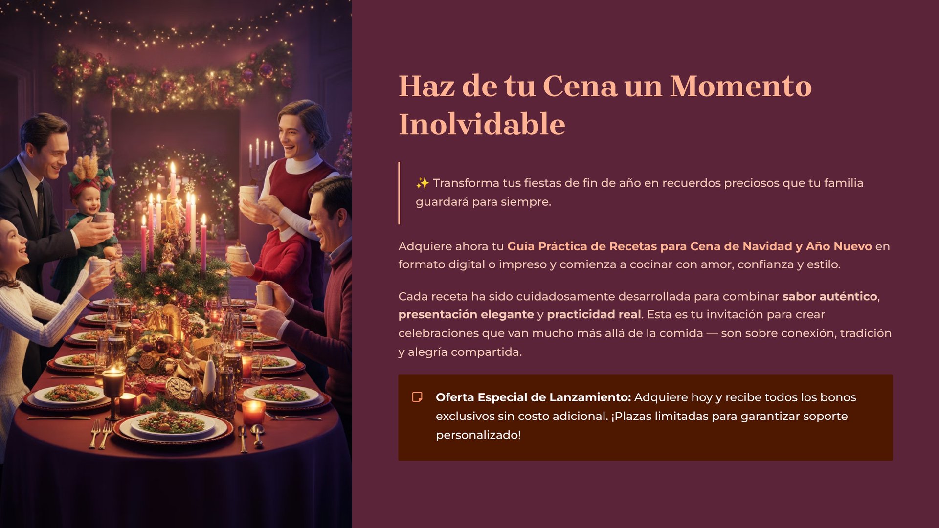 Recetas fáciles y deliciosas Cada plato se explica paso a paso, con ingredientes sencillos y fáciles de encontrar. No necesitas ser chef para preparar una cena navideña digna de un restaurante.